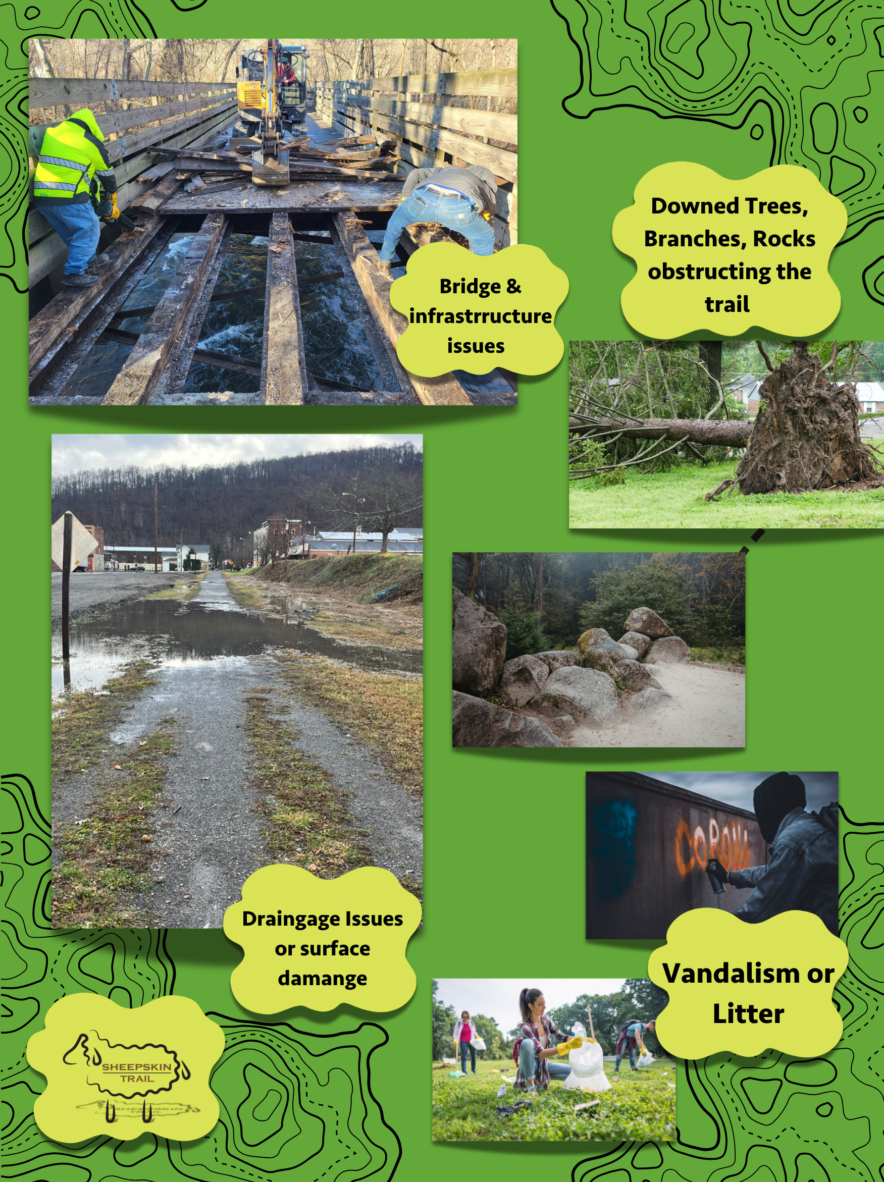 Use the maintenance reporting form to notify us of issues such as surface damage, drainage problems, downed trees, signage concerns, vandalism, or other safety hazards along the Sheepskin Trail.